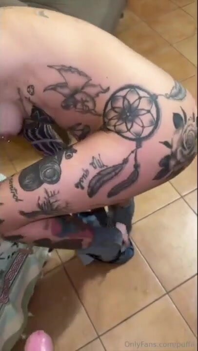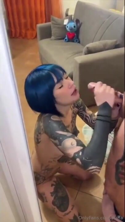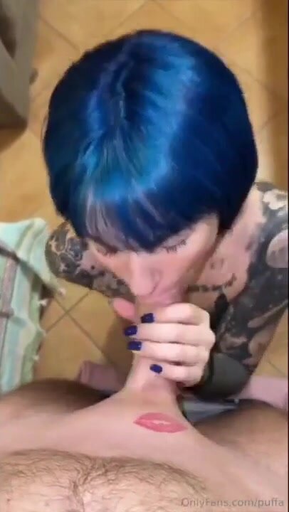 Bella ragazza tatuata dai capelli blu brava di bocca sa come far arrapare e godere il suo maiale.