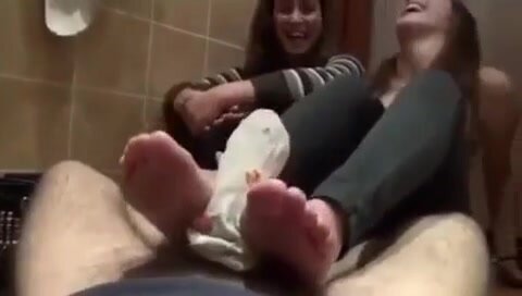 Si fa segare con mani e piedi dalle amiche in bagno, footjob multiplo da urlo
