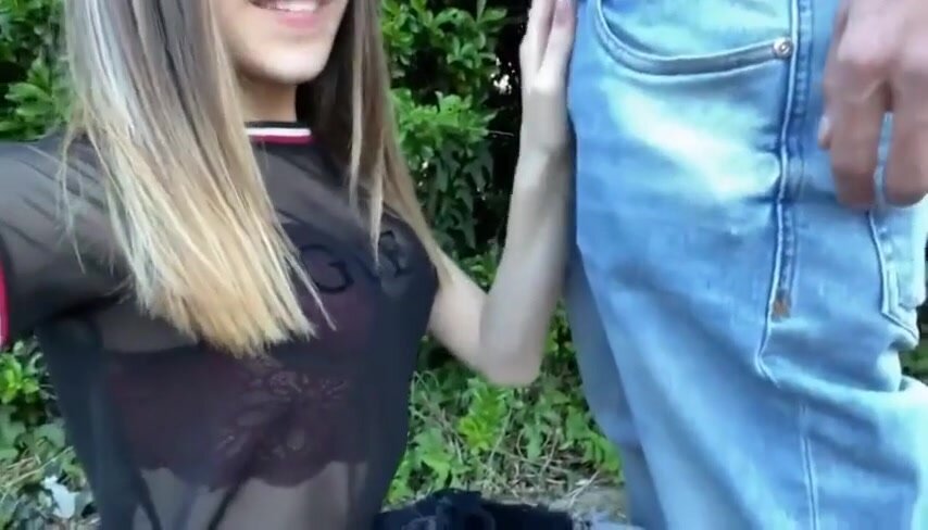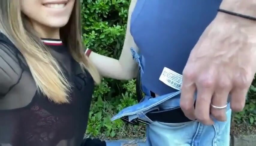 Pompino al fidanzato alla luce del sole nel parco: in un angolo nascosto, si inginocchia e glielo prende in bocca, succhia forte con gente che passa vicino, lo fa sborrare in gola da esibizionista senza vergogna.