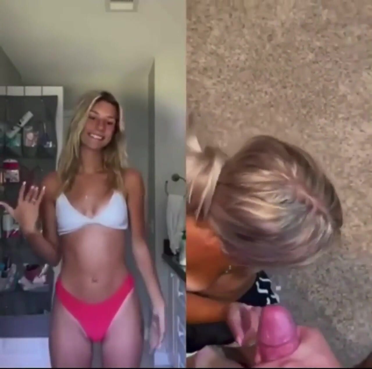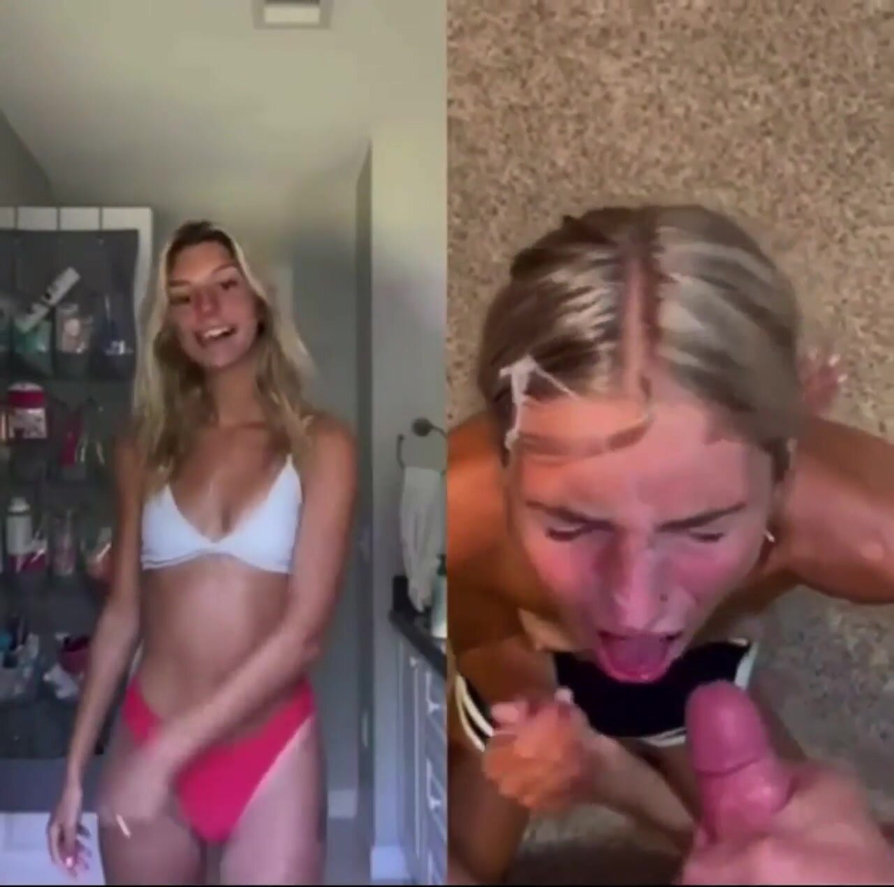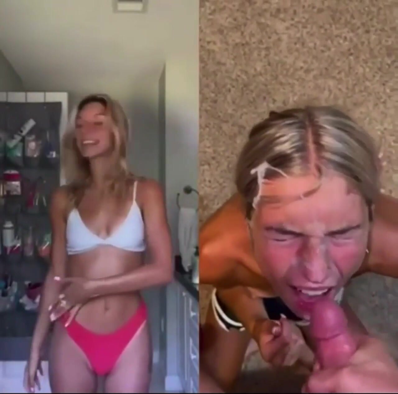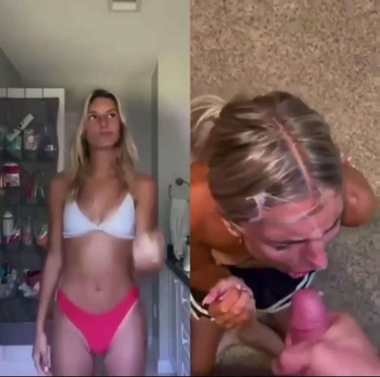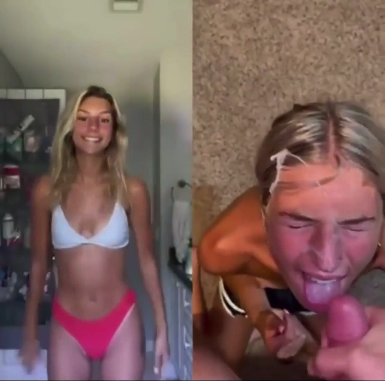 Amica filmata in due differenti momenti: a sinistra è tutta casa e chiesa vestita da brava ragazza, a destra una troia da sborro con pompini, scopate e faccial. Dual face hot amatoriale italiana, contrasto santa-porca con sborrate abbondanti e posizioni hard.