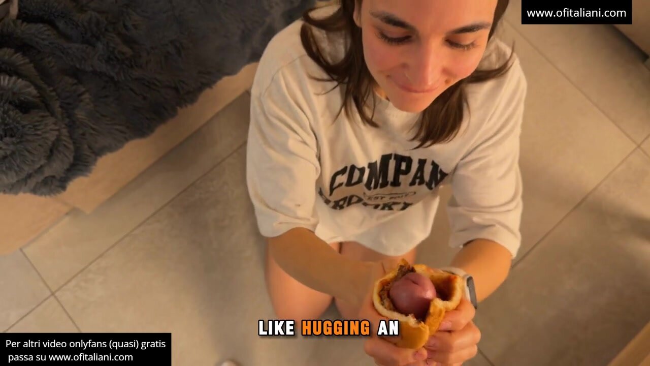 Brunetta troia vogliosa di cazzo chiede alsuo tipo di farcirgli il panino con la sborra e poi lei di gusto se lo mangia tutto !