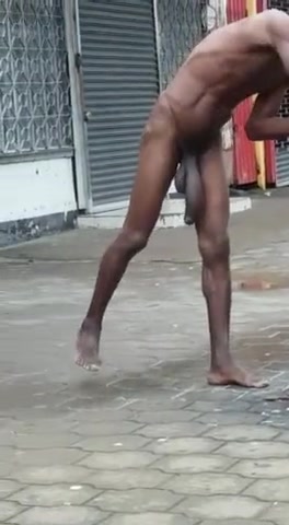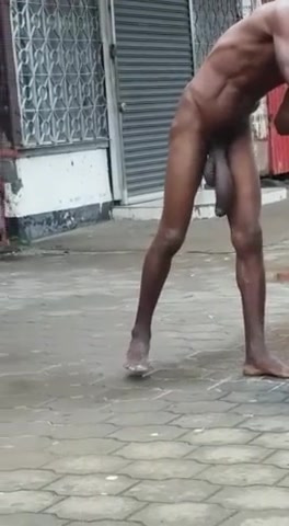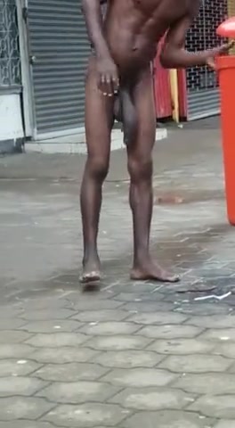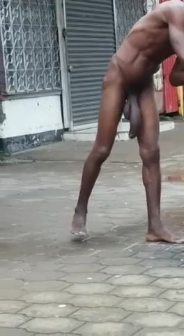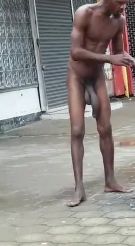 Un uomo di colore gira nudo per strada con il suo mega uccellone penzolante
