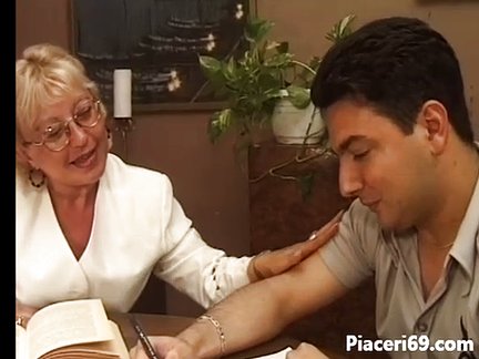 <b>Giovane inesperto scopa la sua vecchia prof</b> - un ragazzo italiano timido che prende ripetizioni si rilassa facendo durante una pausa sesso con la sua anziana insegnante che gli succhia il cazzo e si fa leccare tette e figa.