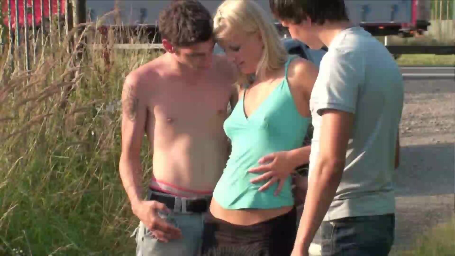 2 puttanieri cazzuti e arrapati si scopano una bella puttanella in strada incuranti del traffico