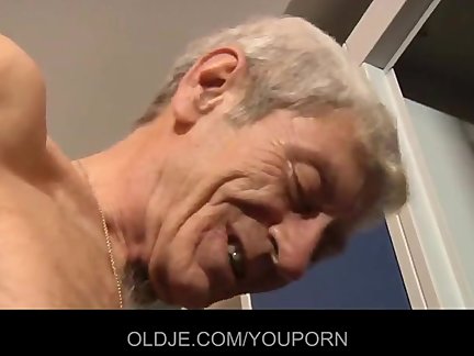 <b>Sesso giovane/vecchio negli spogliatoi </b>- lei è una ragazza carina e arriva mentre lui si sta spogliando mettendolo a disagio... ma poi la brunetta con le tette piccole si avvicina a lui e gli tira giù le mutande iniziando un pompino con sega che sembra darle soddisfazione. Allora lui le lecca la topa umida e gliela chiava col suo cazzo duro sborrandole infine in bocca.