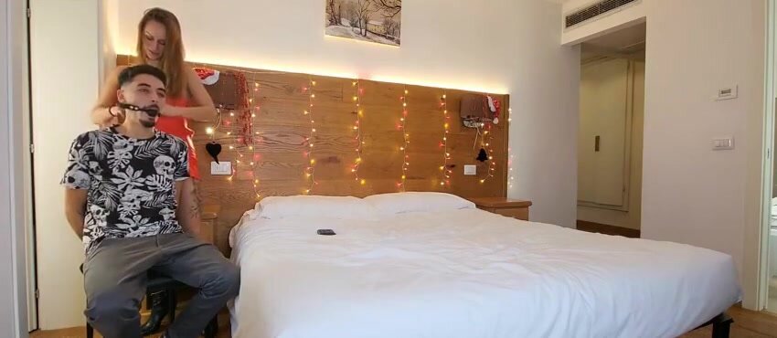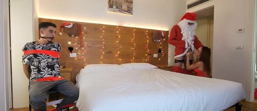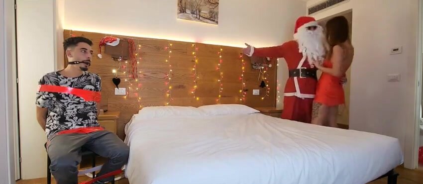 Fidanzato cornuto legato ed imbavagliato viene costretto dalla fuidanzata dominante e troia a guardarla mentre viene scopata da Babbo Natale e dalle renne !