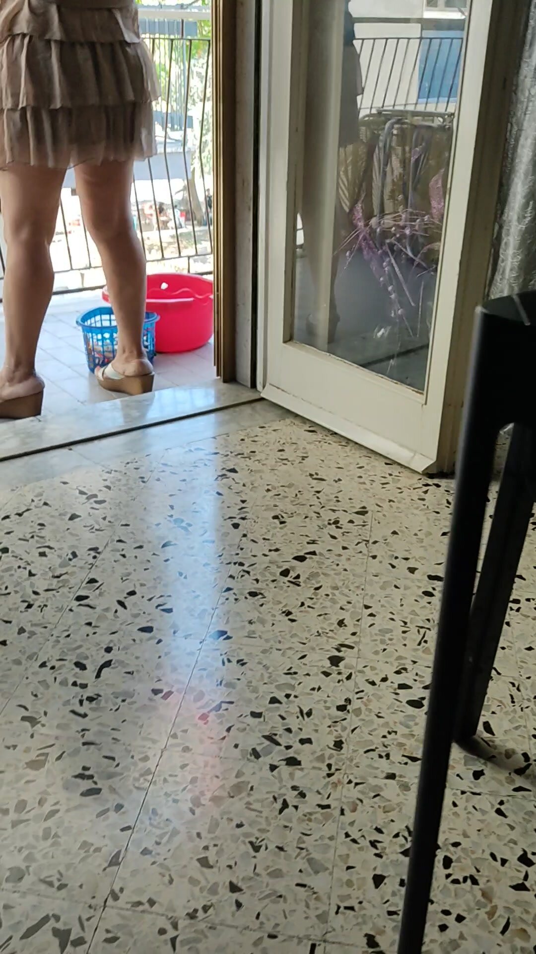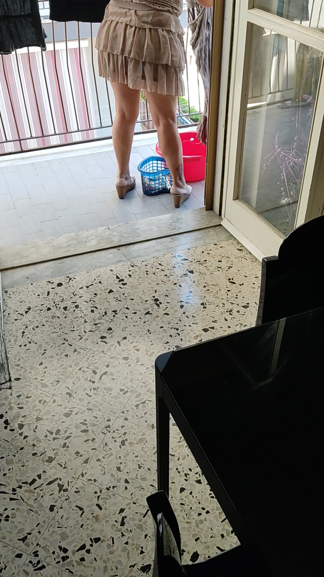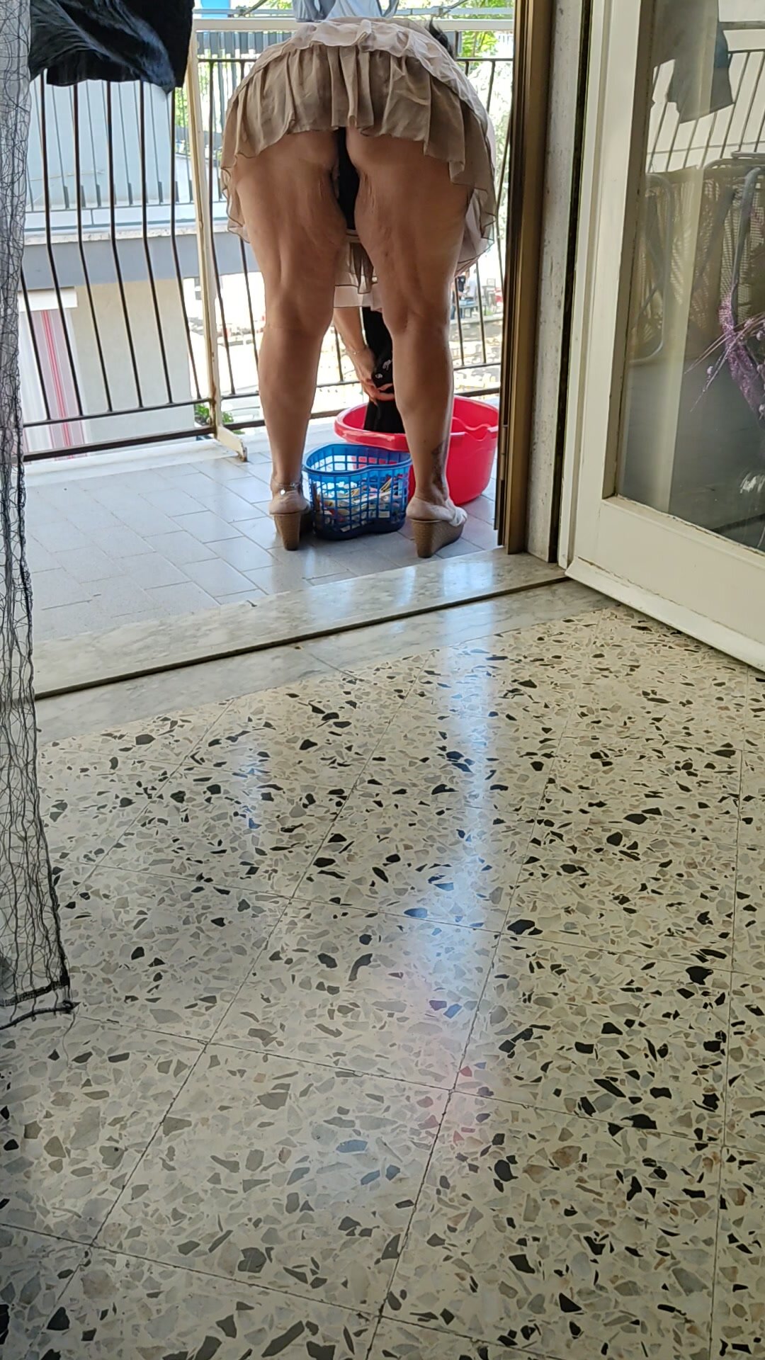 Senza mutande stende e fa vedere le sue coscioni e il culone ai muratori di fronte nel centro città. Nonna 64 anni