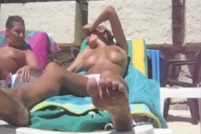 Mamma calda molto attraente spiata mentre sta su una sedia a sdraio a ungersi il corpo con olio abbronzante in una bella giornata di sole. La milf molto attraente mostra le sue stuzzicanti tette succose.