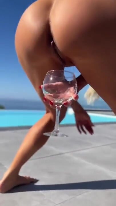 Milf nuda in piscina piscia nel bicchiere e se la versa sule tette
