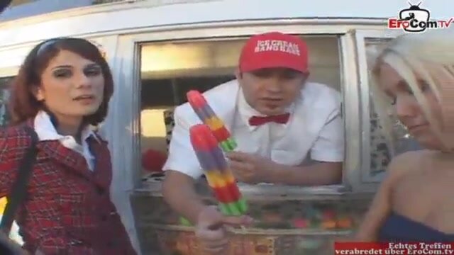 Un gelataio a bordo del suo furgone di gelati, cattura 2 ragazzette troiette, lui le fa ingoiare un ghiacciolo con la loro magica bocca poi le invita a seguirlo sul suo furgone dove le fa ingoiare il suo enorme paletto di carne che poi le infila profondamente in figa facendole miagolare dal piacere mentre continuano a baciarsi